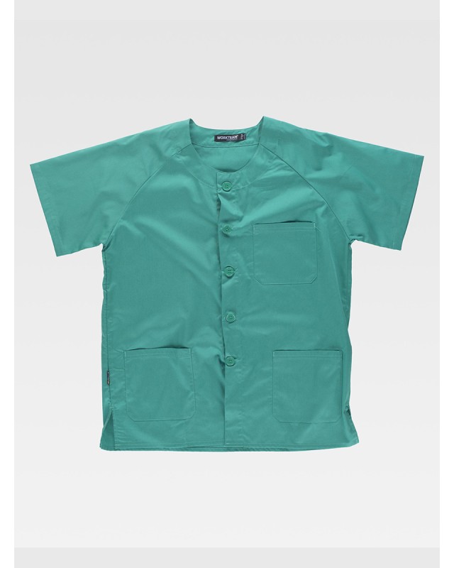 - Descrizione: Casacca unisex con girocollo Manica corta Chiusura a bottoni; Una tasca sul petto e due laterali Manica raglan Composizione: 65% poliestere + 35% cotone. Peso: 160 gr/m2. Busto: cuciture laterali.