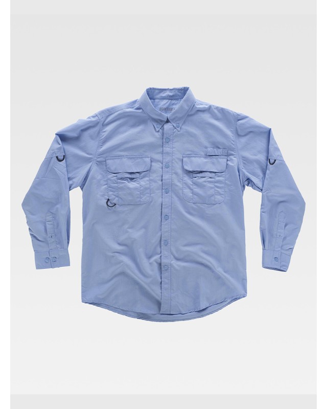 • Descrizione: Camicia botton down manica lunga, tipo safari multitasche; Carrè sulla schiena; Apertura dietro verticale con rete interiore; Passante elastico nella manica per regolare la lunghezza; Tasche con patta nel petto e chiusura con velcro Composizione: 100% nylon. Peso: 105 gr/m2. Busto: cuciture laterali.