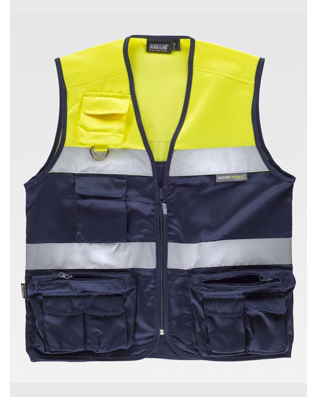 - Descrizione: Gilet con chiusura a cerniera di nylon; Scollatura a punta; Due tasche sul petto di diverse dimensioni con patta di velcro; Due tasche laterali con cerniera e tasche esterne con patte di velcro; Due strisce riflettenti su petto e spalla; Combinato con alta visibilità; Filettato Composizione: 65% poliestere + 35% cotone. Peso: 200 gr/m2. Busto: cuciture laterali.