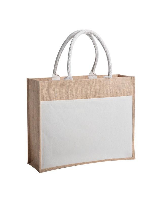 • Descrizione: borsa shopping/mare juta e cotone manici imbottiti tasca frontale in cotone colore naturale Tecnica di stampa consigliata: Serigrafica - Transfer - Dimensioni: cm 45x35x11 ca - Materiale: juta e cotone