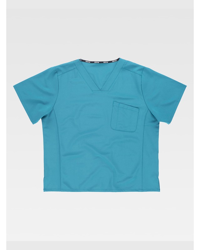 - Descrizione: Casacca unisex elasticizzata manica corta; Collo a V; Tasca sul petto e tascino porta penne; Spacchi sui fianchi Composizione: 93% poliestere + 7% elastane. Peso: 170 gr/m2. Busto: cuciture laterali.