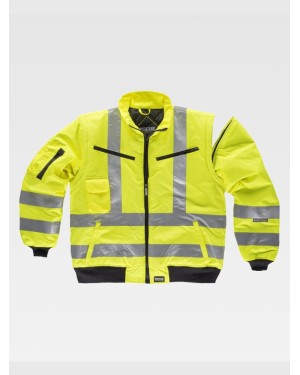 - Descrizione: ALTA VISIBILITà EN ISO 20471:2013. Classe 3; PROTEZIONE CONTRO AMBIENTI FREDDI IN 14058:2004. Classe 3; PROTEZIONE CONTRO LA PIOGGIA EN 343. CLASSE 3/1; Giubbotto maniche staccabili, imbottito bicolore certificato alta visibilità; Collo alto,polsi e vita elastici; Due tasche sul petto con cerniere,una tasca per cellulare, due tasche laterali con apertura obliqua; Una tasca sulla manica con cerniera di nylon; Due su petto , maniche e spalle Composizione: 100% poliestere. Peso: 430 gr/m2. Busto: cuciture laterali.