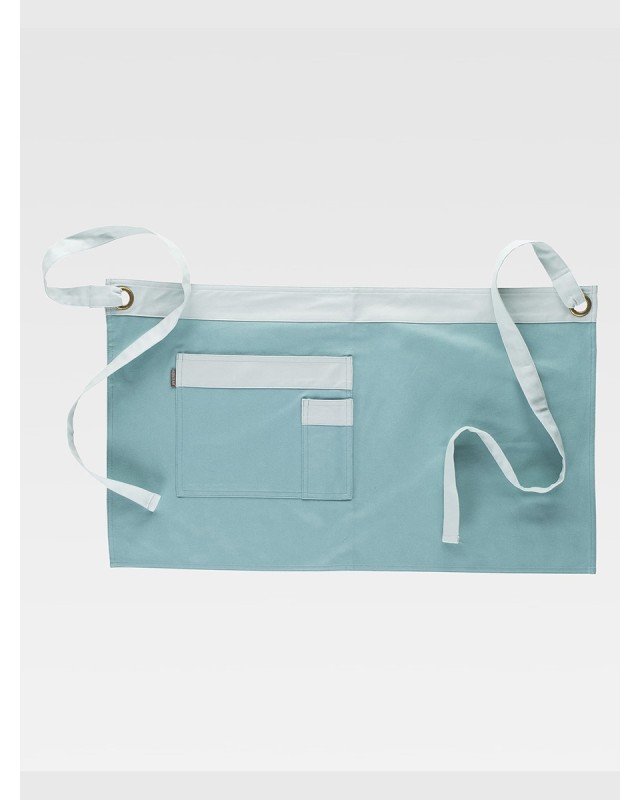 - Descrizione: Grembiule corto in tessuto canvas bicolore; Una tasca laterale bicolore con taschino sovrapposto; Bande per regolare la vita; Design moderno con rivetti in rame; Tessuto antimacchie Composizione: 87% cotone + 12% poliestere + 1% elastane. Peso: 250 gr/m2.