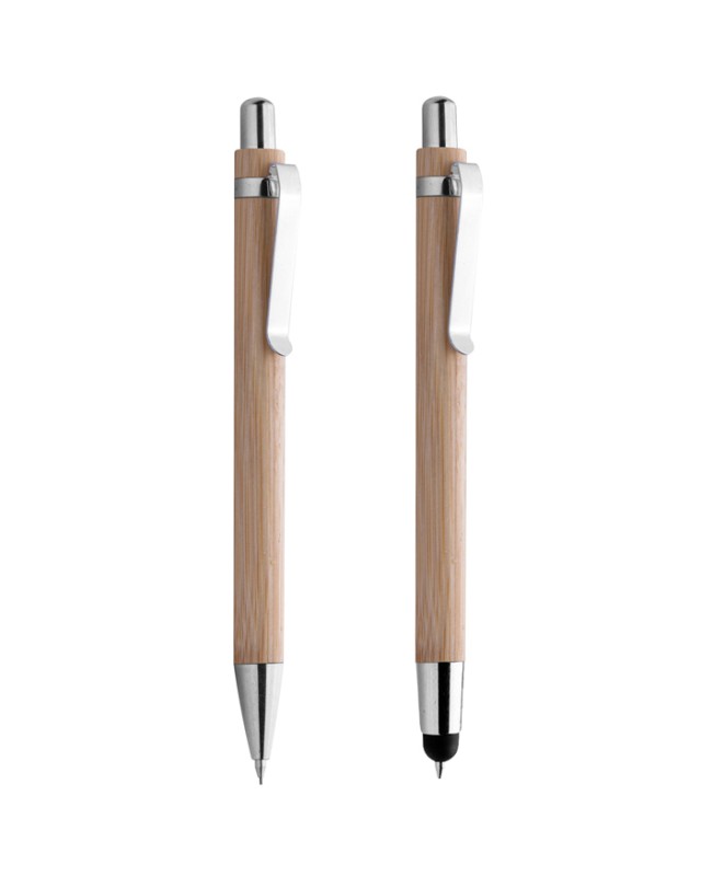 - Descrizione: penna con gommino touch micromina automatica refill nero minuterie in metallo cromato astuccio in carta effetto legno - Dimensioni: penna Ø cm 1,1xh14 ca micromina Ø cm 1,1xh14 ca astuccio: 17x4x2,2 - Materiale: bamboo e metallo